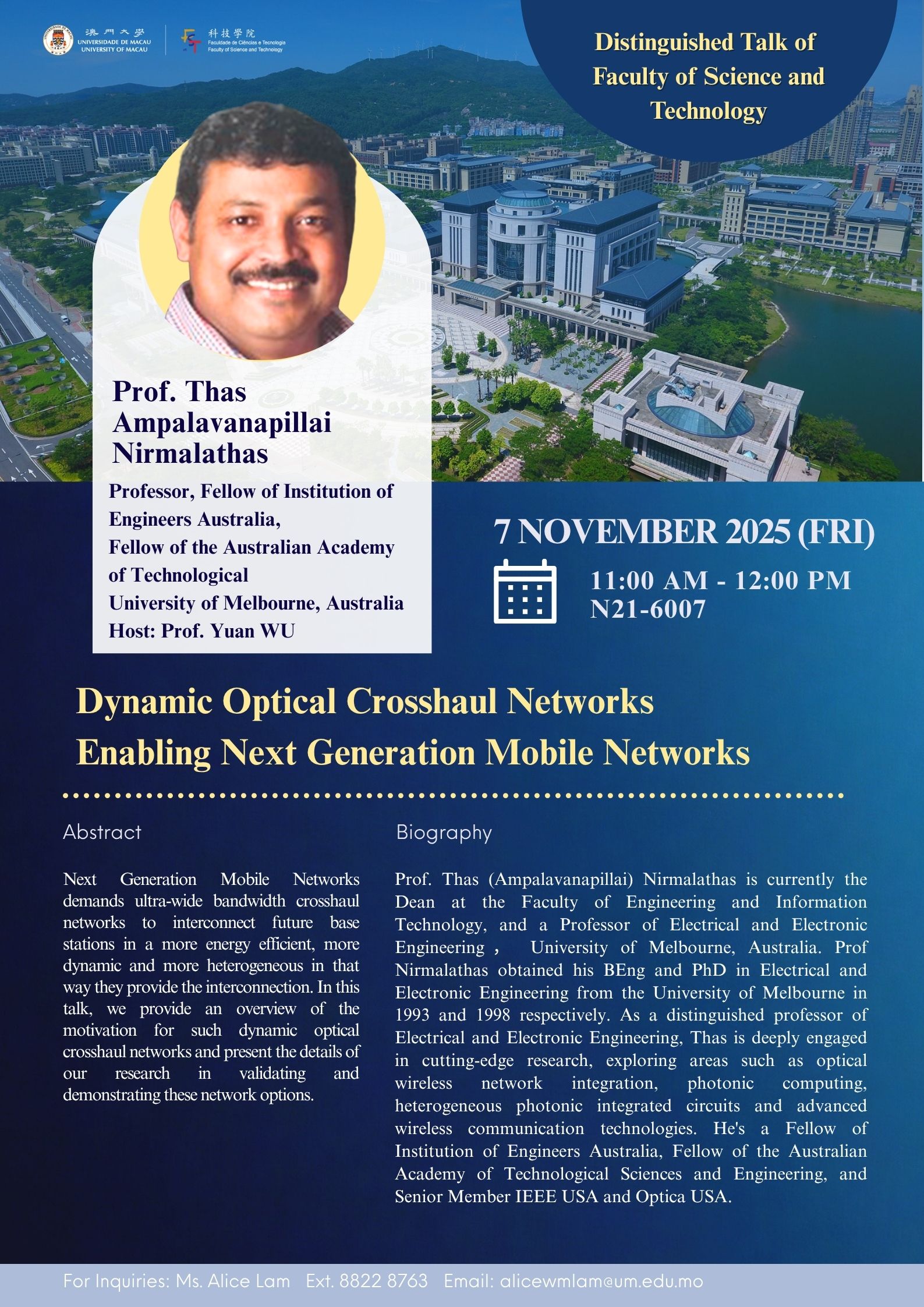 FST Distinguished Talk – Dynamic Optical Crosshaul Networks Enabling Next Generation Mobile NetworksSpeaker: Prof. Thas Ampalavanapillai Nirmalathas from University of MelbourneHosted by: Prof. Yuan WU