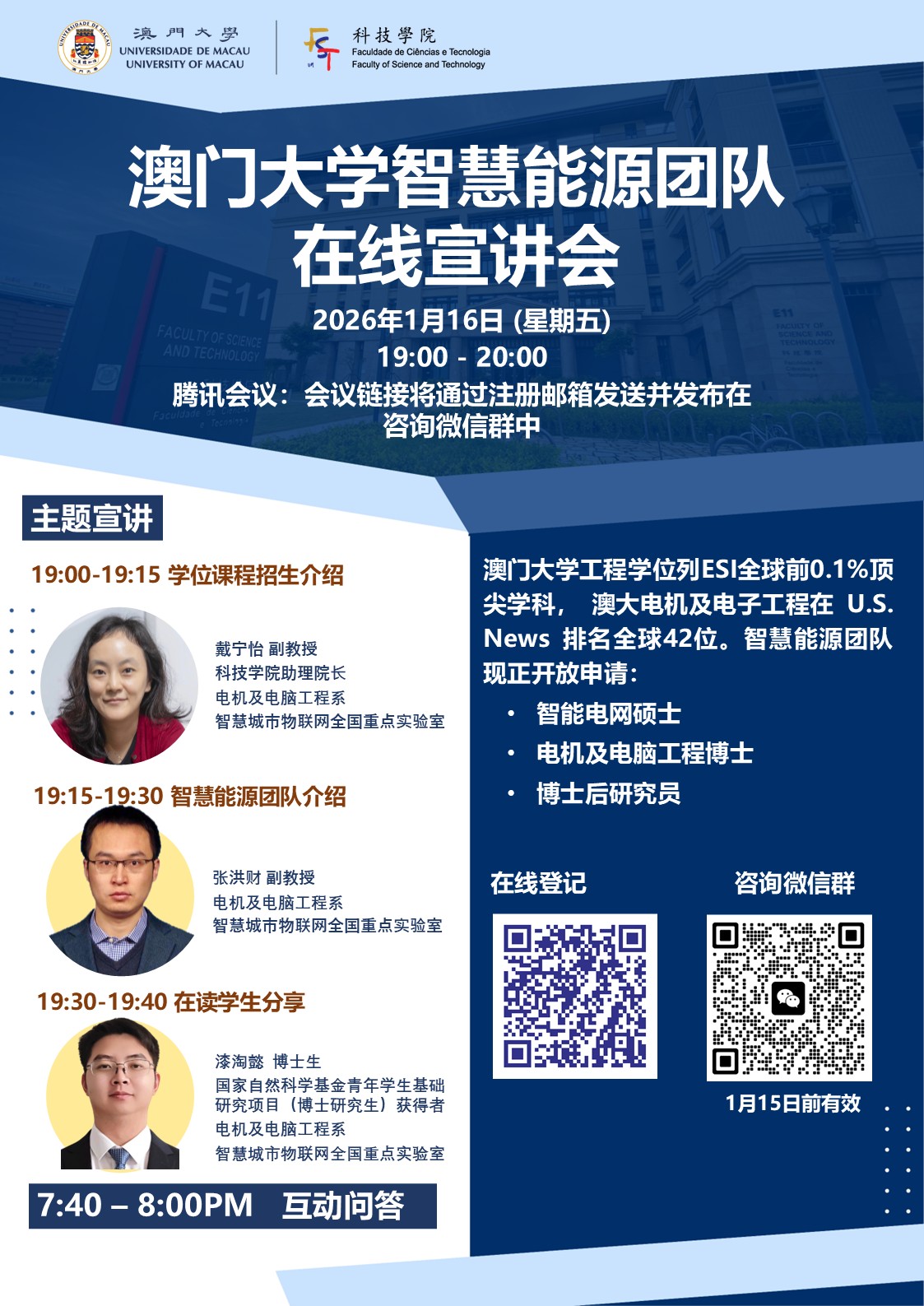 2026-01-09 @ 3:00 pm - 4:00 pm FST MO-HQ Distinguished Talk Series – Intelligent Listening: Extending AI from Vision to Sound and Vibration SensingSpeaker: Prof. Jie ZHANG from University of Science and Technology of ChinaHosted by: Prof. Cheng-Zhong XU N21-6007 ...