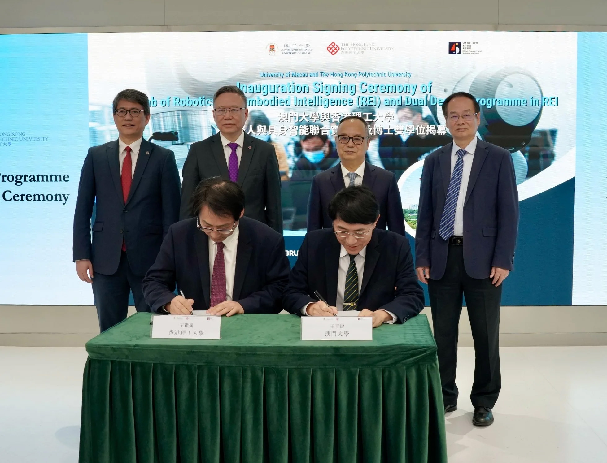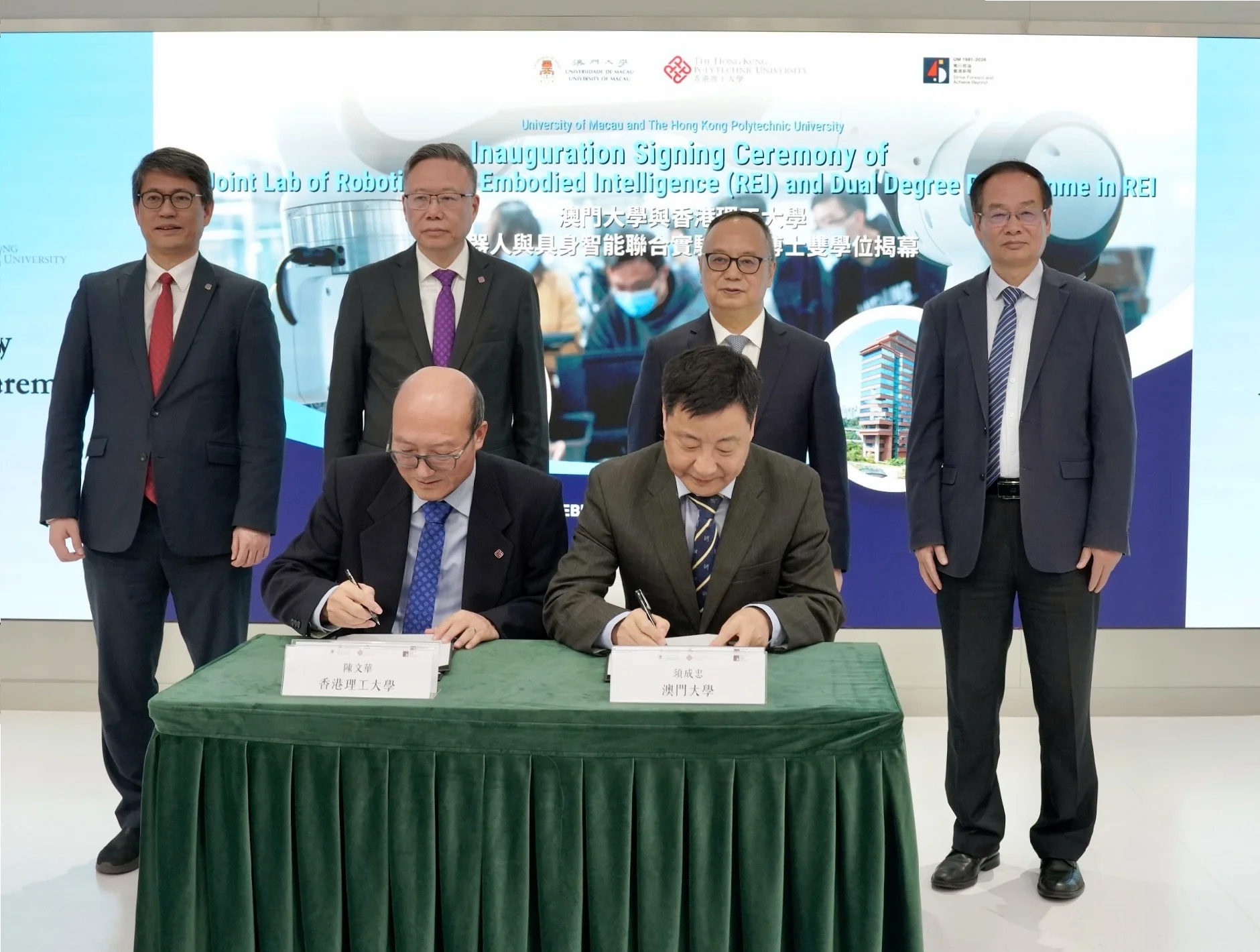 Yonghua Song, rector of UM, said that the Joint Laboratory for Robotics and Embodied Intelligence brings together UM’s strengths in interdisciplinary research, artificial intelligence, and engineering with PolyU’s expertise in applied science and engineering practice. The laboratory will advance fundamental research and promote technology transfer in cutting-edge fields such as intelligent robotics and embodied artificial intelligence. In addition to building on the two universities’ long-standing research collaboration, the laboratory will serve as a strategic platform for cultivating high-quality innovative talent. Song added that the four-year dual PhD programme features joint supervision by faculty members from both institutions. Students will have the opportunity to study and conduct research in both Macao and Hong Kong and will receive doctoral degrees from both universities upon graduation. The initiative aims to synergise the disciplinary and technological strengths of both institutions and establish an internationally competitive doctoral training model for the Greater Bay Area, thereby supporting China’s high-quality development and the development of world-class research hubs.