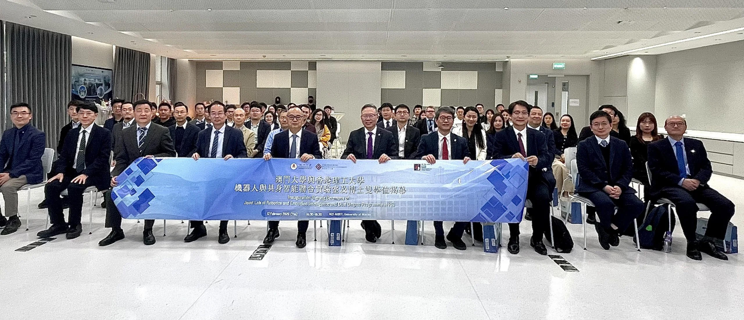 The University of Macau (UM) and The Hong Kong Polytechnic University (PolyU) signed an agreement today (12 February) at UM to establish the first joint laboratory co-funded by Macao and Hong Kong—the Joint Laboratory for Robotics and Embodied Intelligence. The initiative aims to strengthen collaborative innovation in higher education and scientific research in the Guangdong–Hong Kong–Macao Greater Bay Area. In addition, UM and PolyU announced the launch of a dual PhD programme featuring joint supervision by faculty members from both universities, marking a significant step forward in collaboration on frontier technologies and high-level talent development. The joint PhD programme is now open for applications.