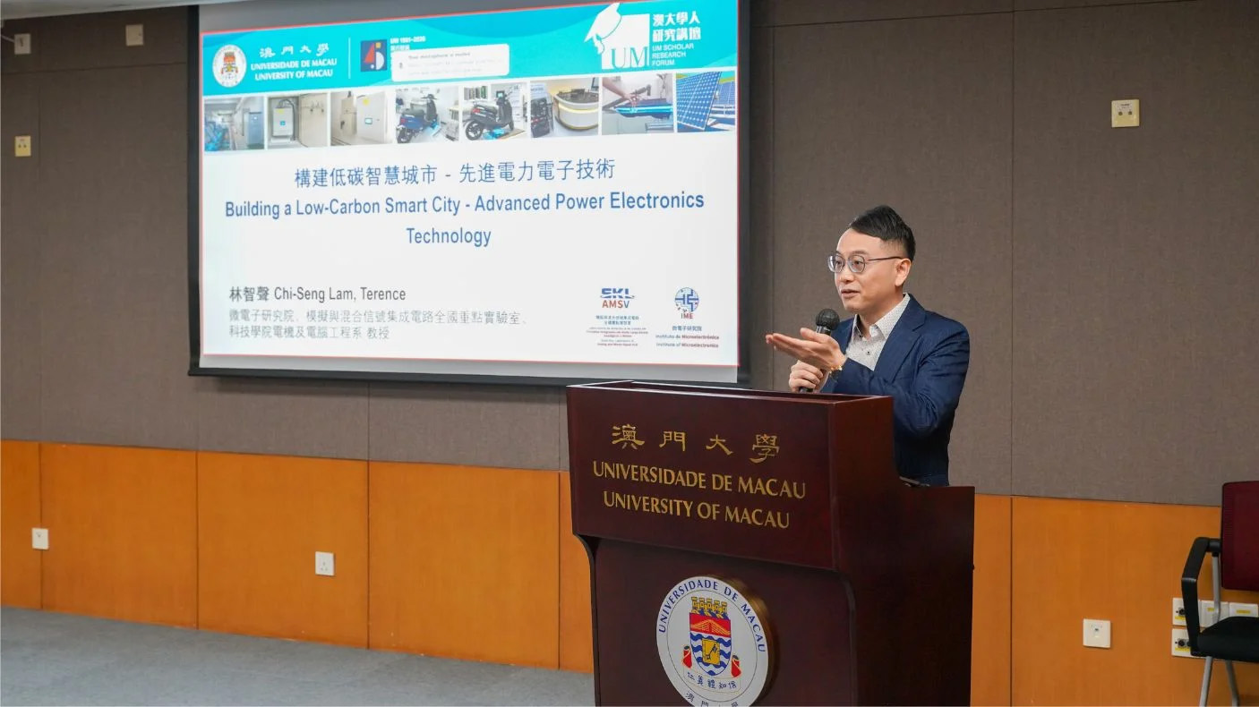 The University of Macau (UM) held the 33rd UM Scholar Research Forum today (21 April), where Lam Chi Seng, professor in the Institute of Microelectronics, the State Key Laboratory of Analog and Mixed-Signal VLSI, and the Department of Electrical and Computer Engineering in the Faculty of Science and Technology at UM, delivered a talk titled ‘Building a Low-Carbon Smart City – Advanced Power Electronics Technology’. The talk was well attended by students, faculty, and members of the public.